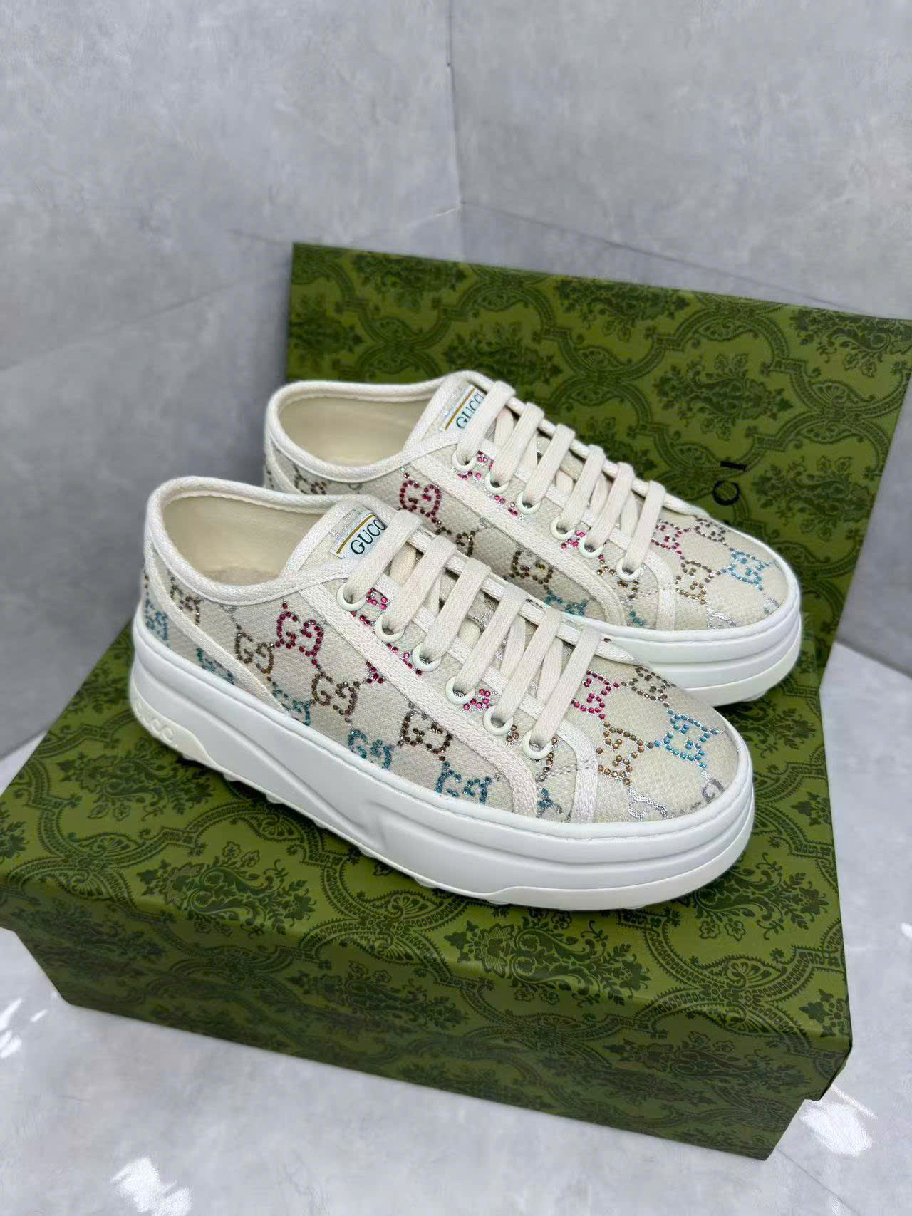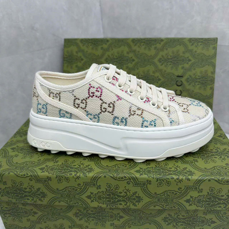 Ảnh chụp thật Giày Gucci cột dây màu trắng họa tiết logo chữ nhiều màu likeauth GNGC94 hàng siêu cấp do xưởng sản xuất cung cấp.