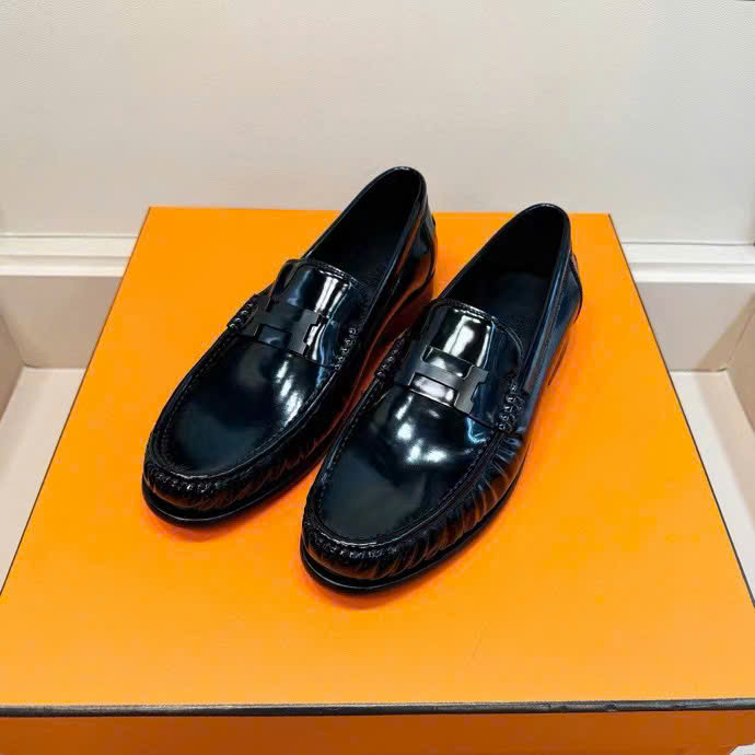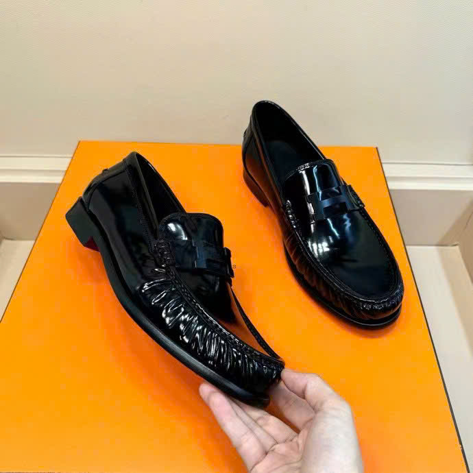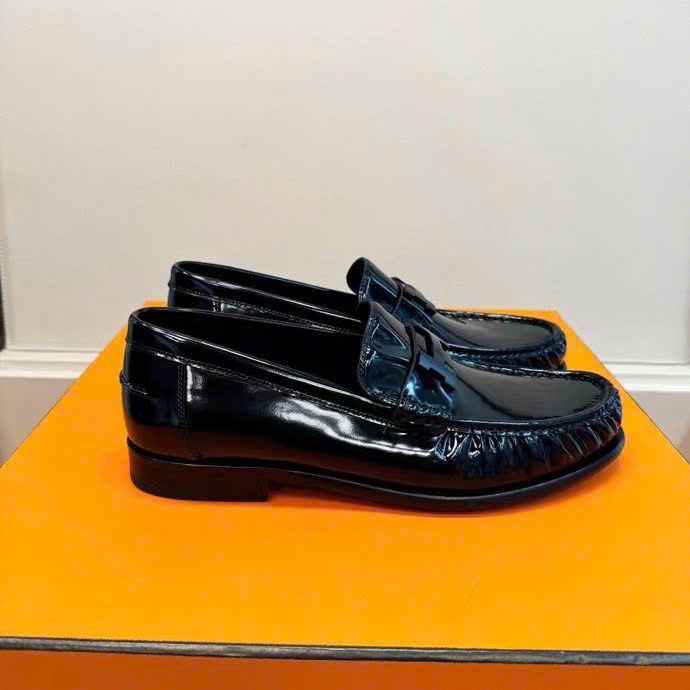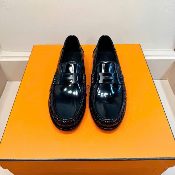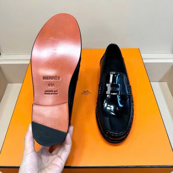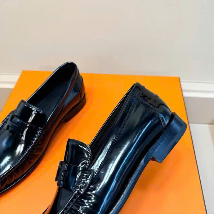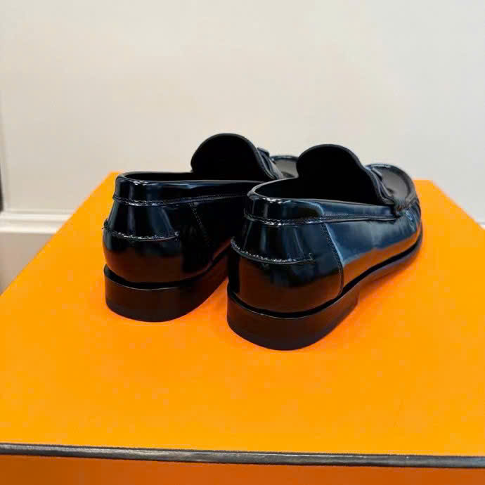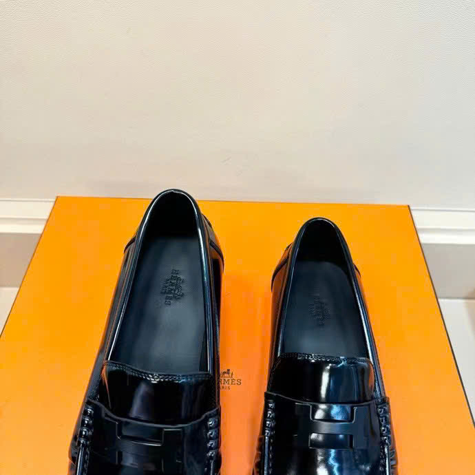 Ảnh chụp thật Giày lười Hermes đế cao mà đen da bóng họa tiết chữ H đen GLH91 hàng siêu cấp do xưởng sản xuất cung cấp.