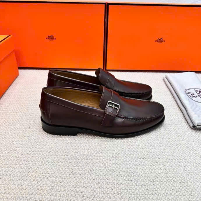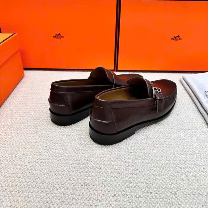 Ảnh chụp thật Giày lười Hermes đế cao mà nâu da trơn họa tiết khuy lệch GLH94 hàng siêu cấp do xưởng sản xuất cung cấp.