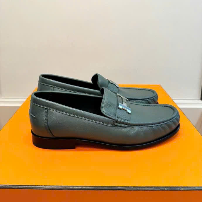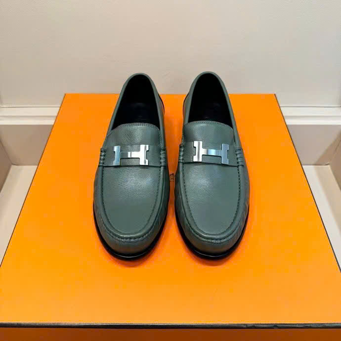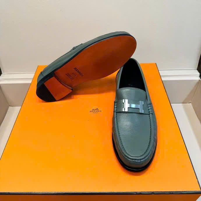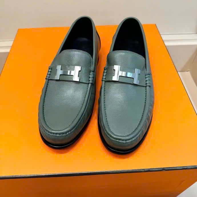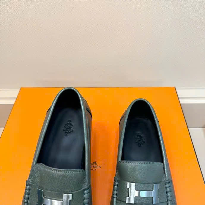 Giày lười Hermes đế cao màu xanh rêu trầm họa tiết chữ H trắng GLH90