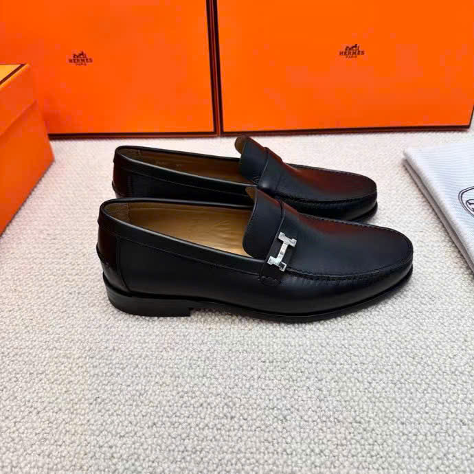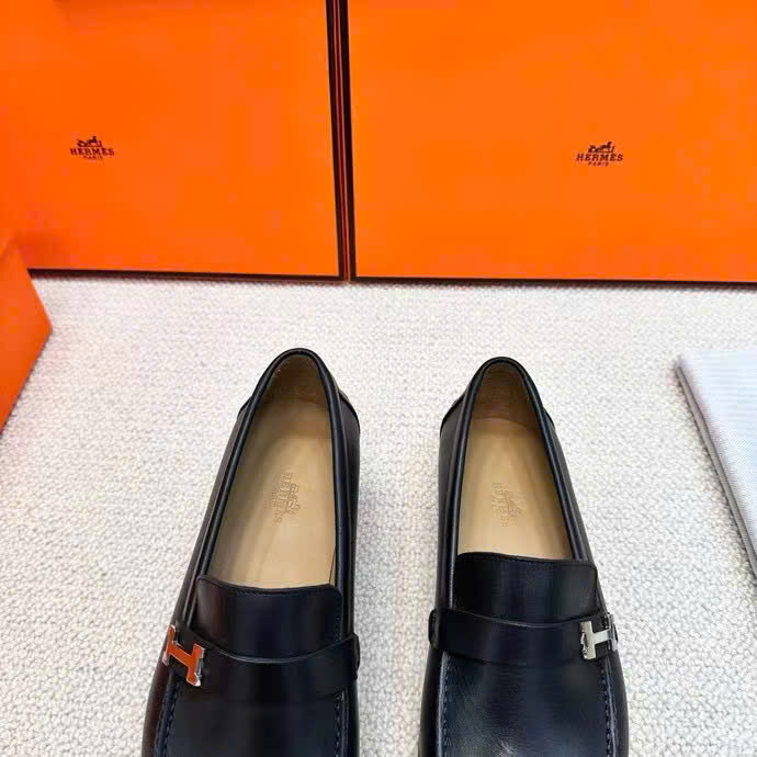 Giày lười Hermes màu đen da trơn họa tiết H lệch trắng GLH96