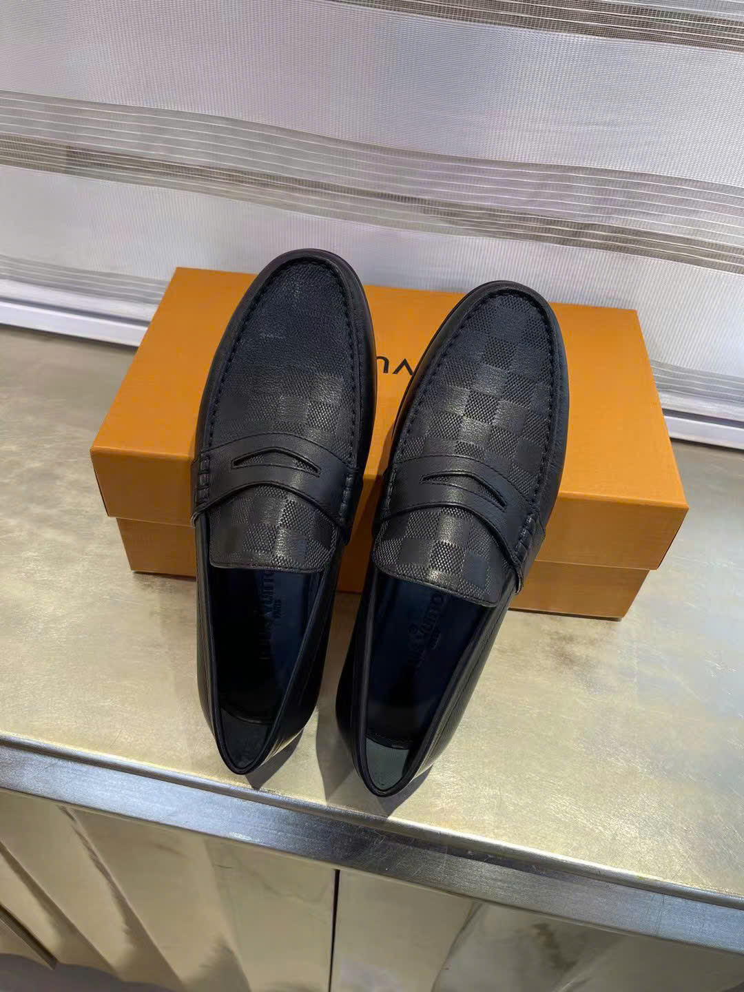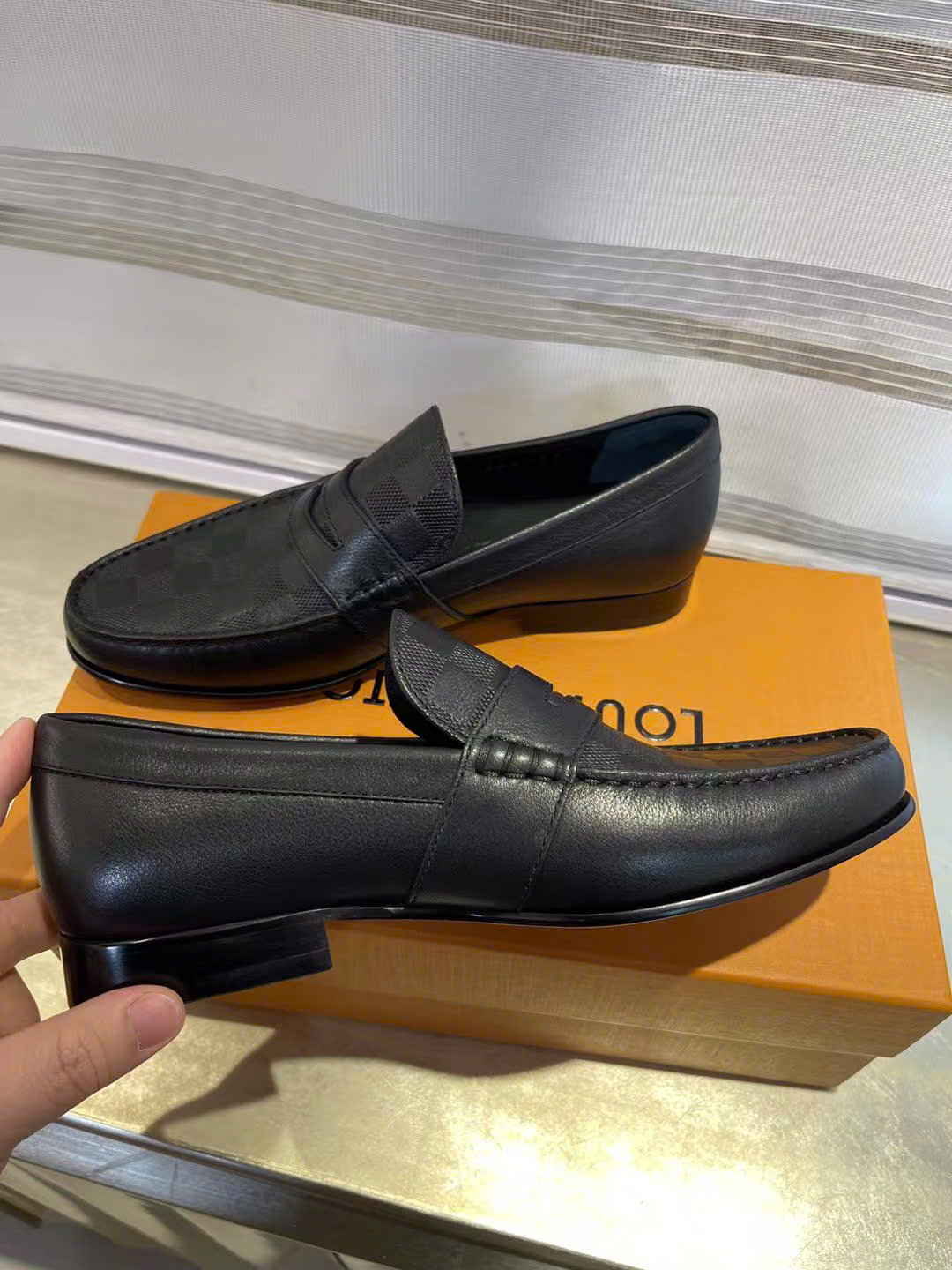 Ảnh chụp thật Giày lười Louis Vuitton da đen lì đế cao họa tiết caro dập chìm GLLV33 hàng siêu cấp do xưởng sản xuất cung cấp.