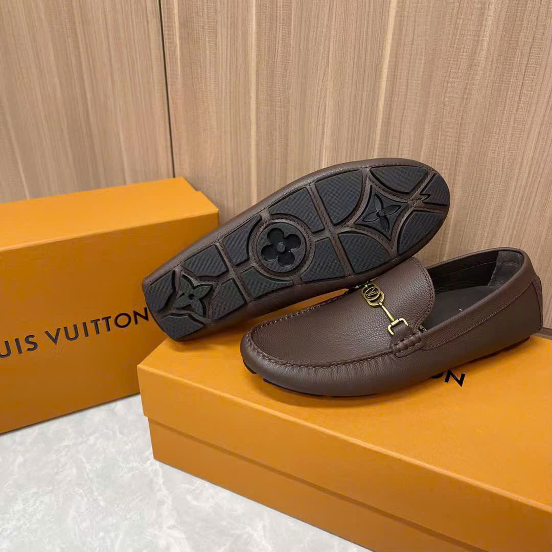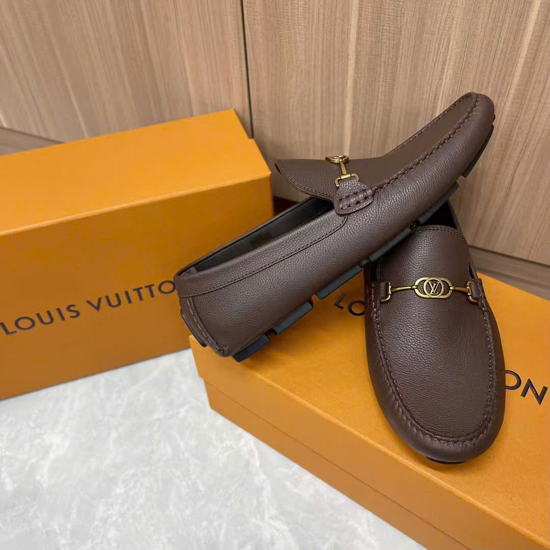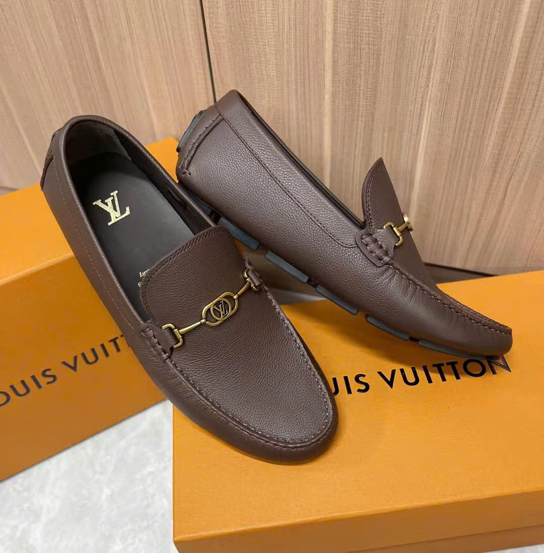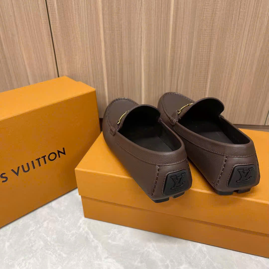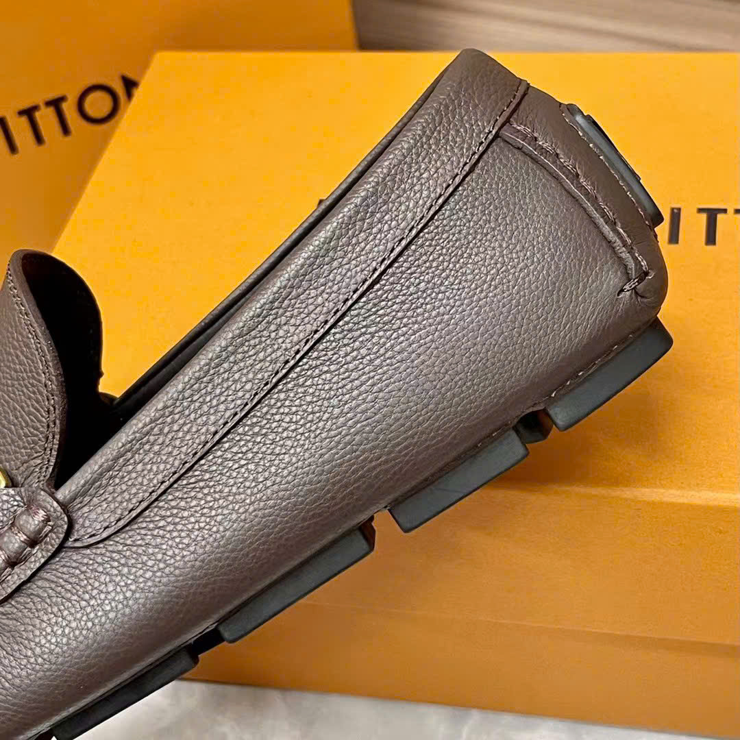 Ảnh chụp thật Giày lười Louis Vuitton da nhăn nâu họa tiết logo chữ nhỏ vàng likeauth GLLV82 hàng siêu cấp do xưởng sản xuất cung cấp.