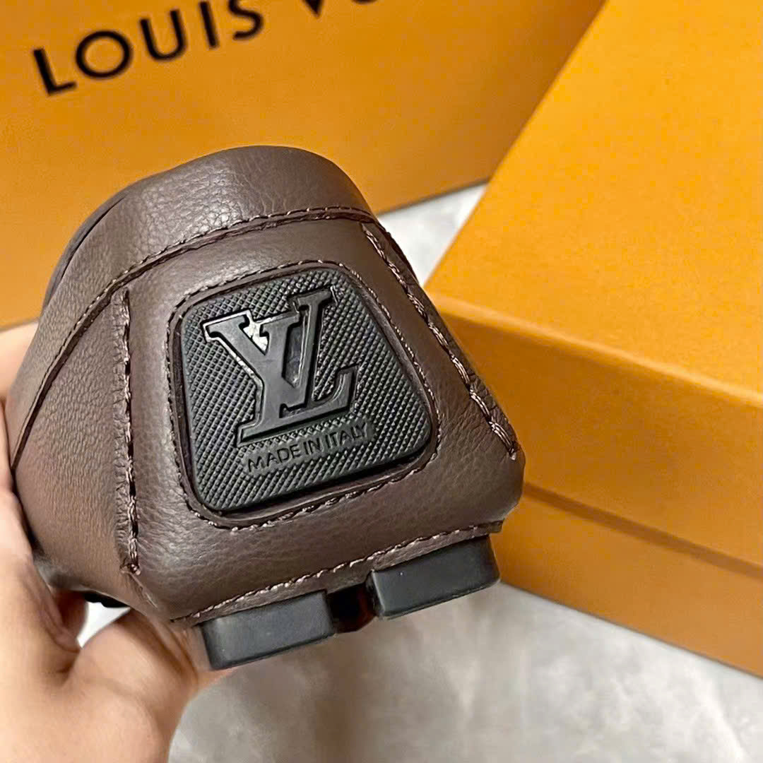 Lợi ích khi mua Giày lười Louis Vuitton da nhăn nâu họa tiết logo chữ nhỏ vàng likeauth GLLV82 siêu cấp tại HoangNguyenStore