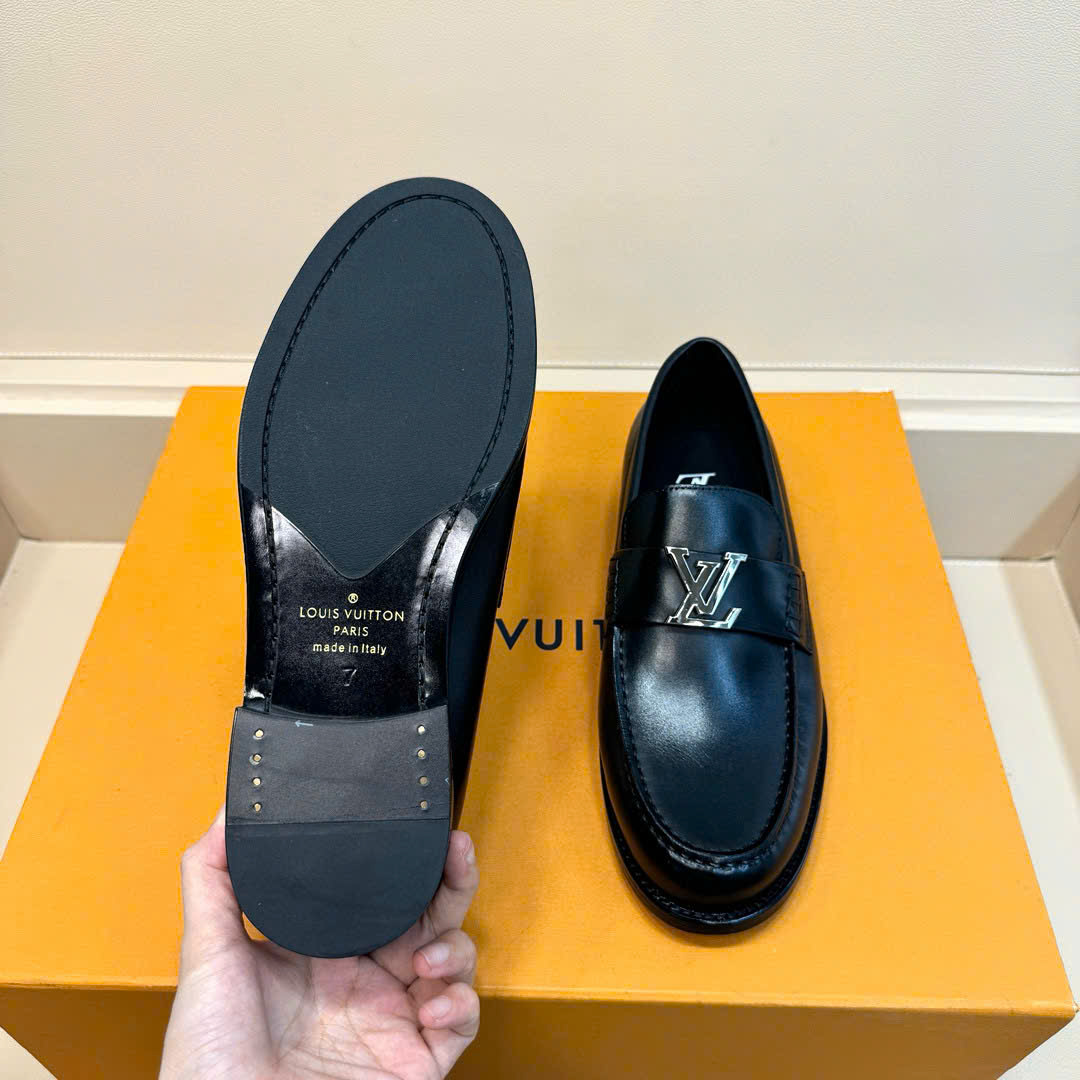 Ảnh chụp thật Giày lười Louis Vuitton đế cao da trơn đen họa tiết logo trắng GLLV68 hàng siêu cấp do xưởng sản xuất cung cấp.