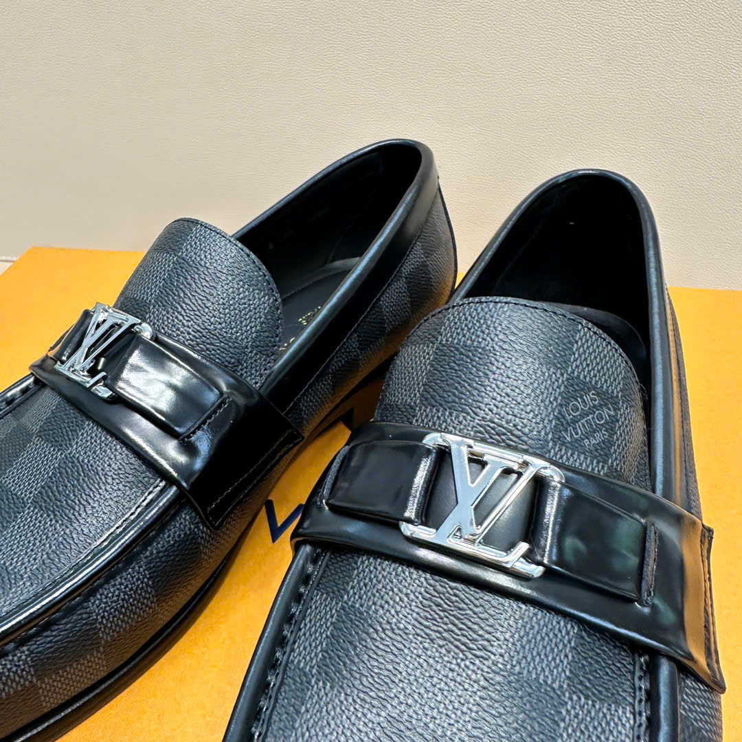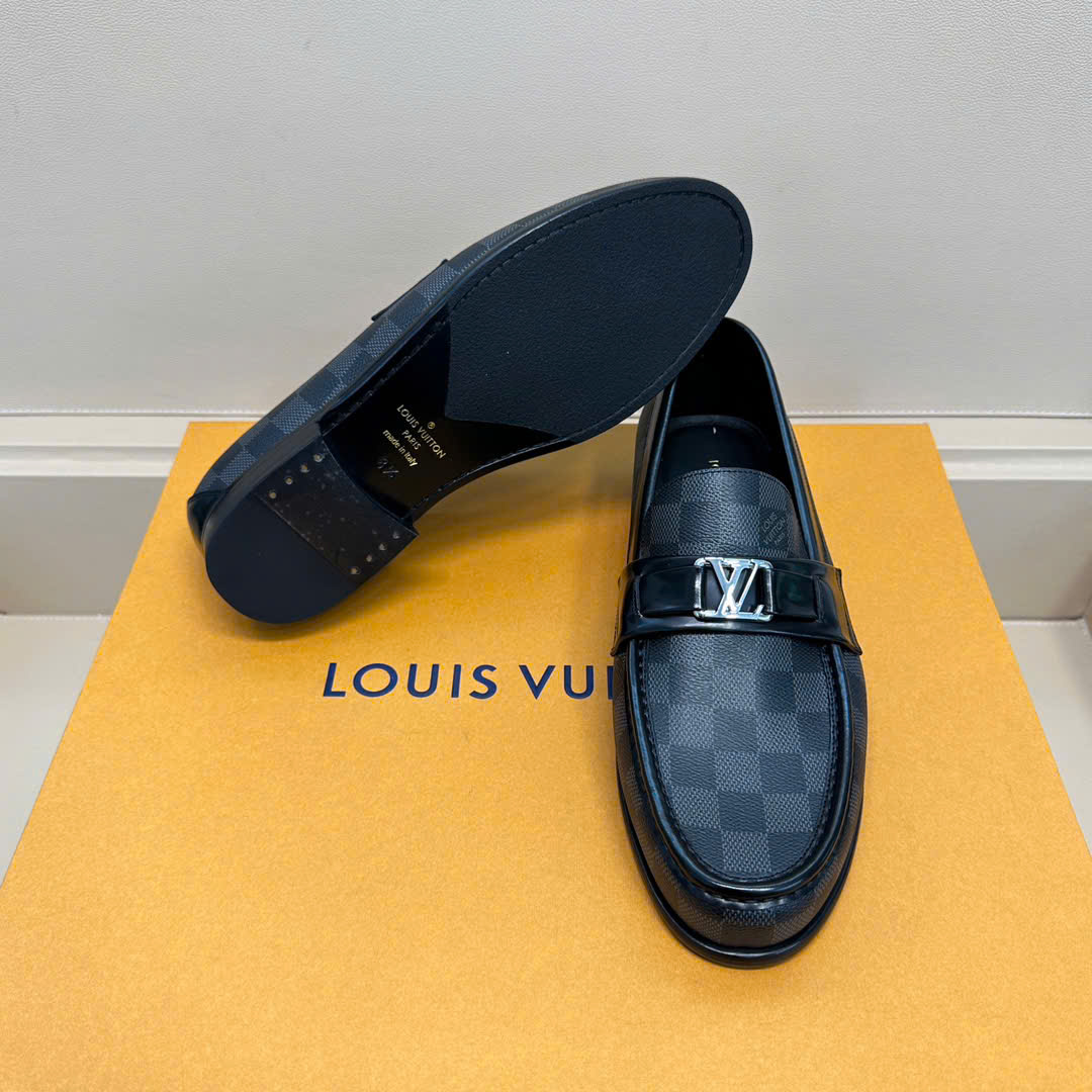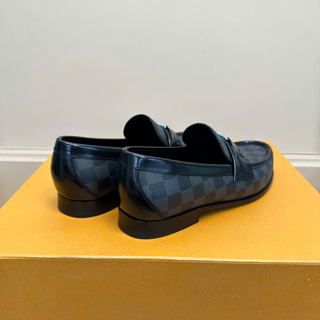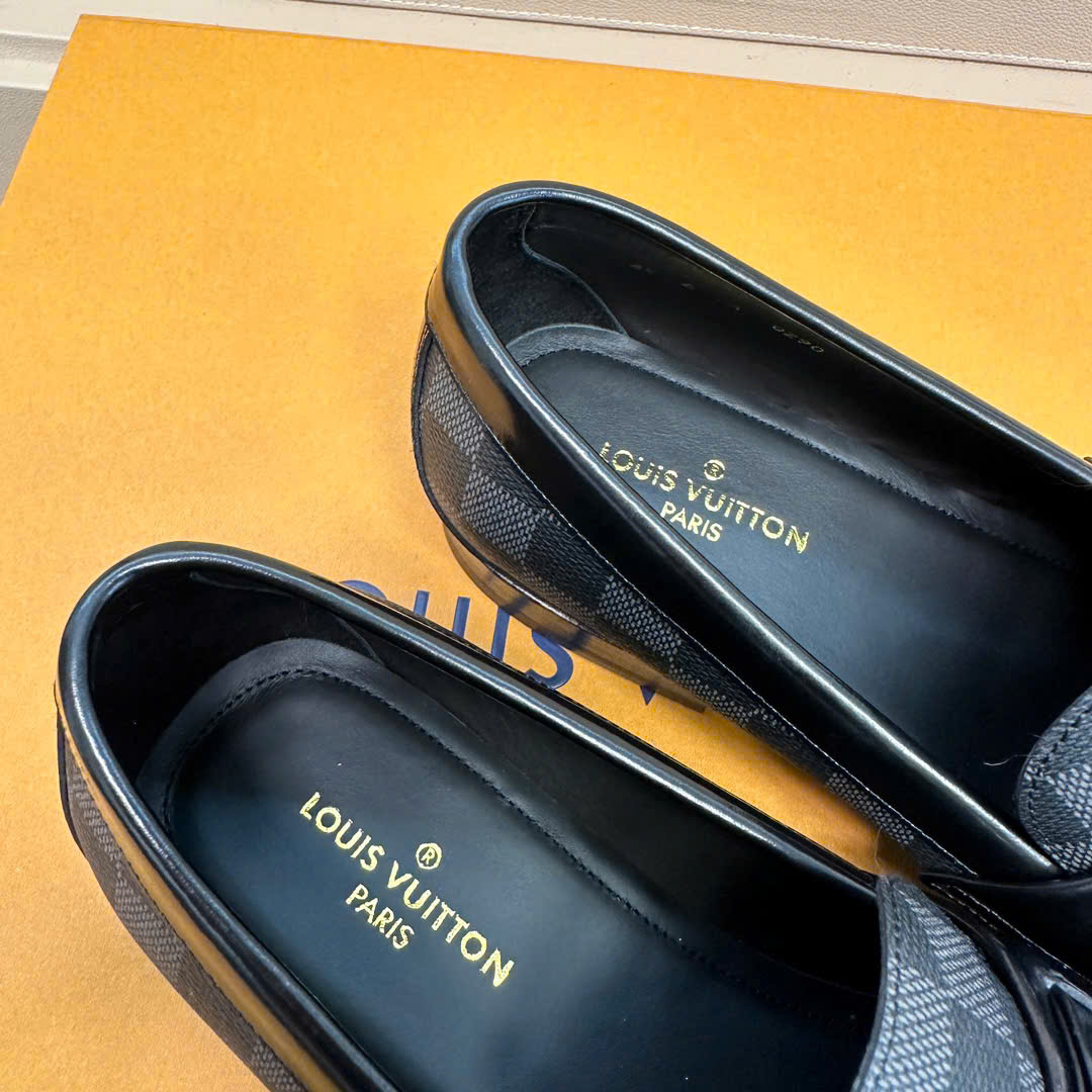 Ảnh chụp thật Giày lười Louis Vuitton like au đế cao hoạ tiết caro đen GLLV29 hàng siêu cấp do xưởng sản xuất cung cấp.
