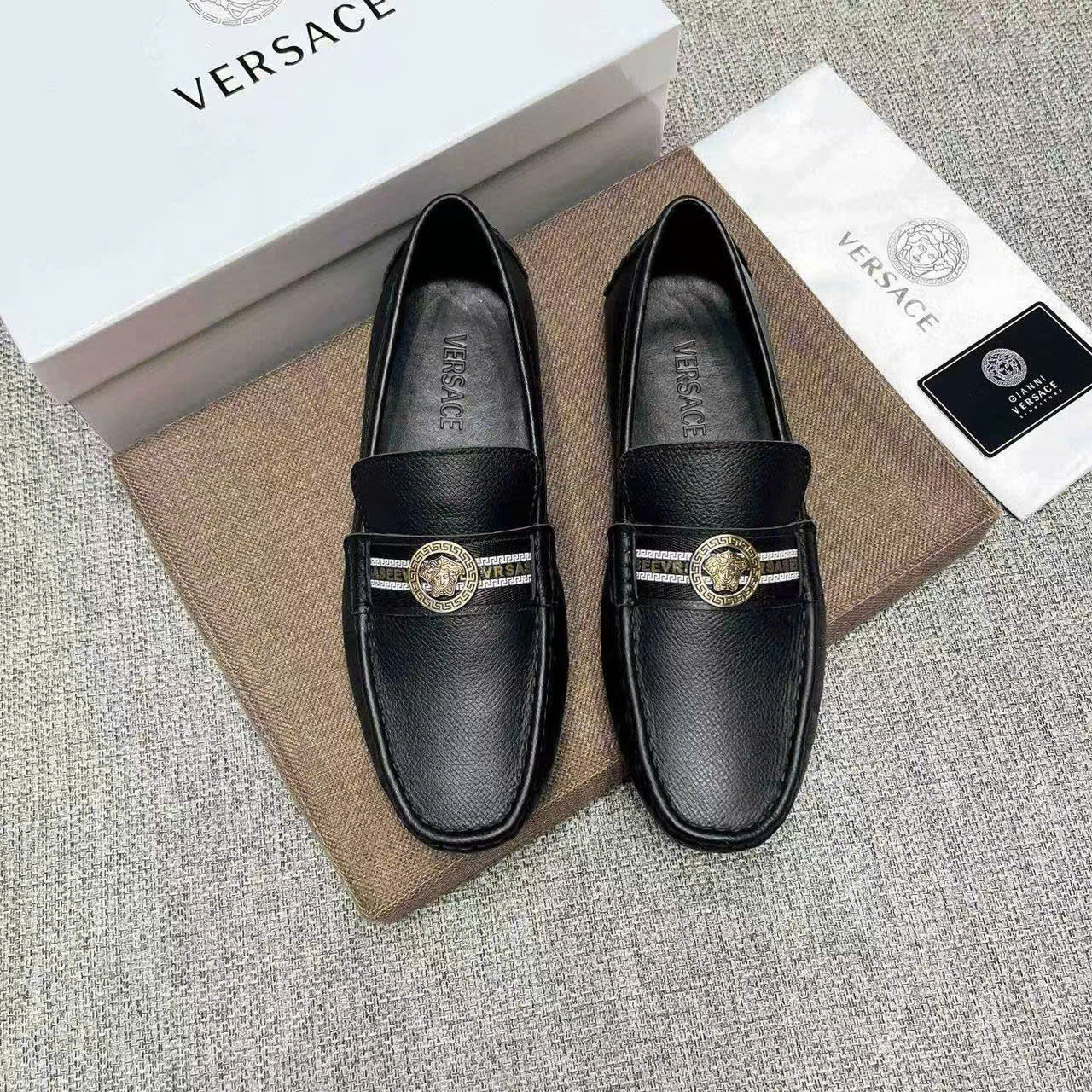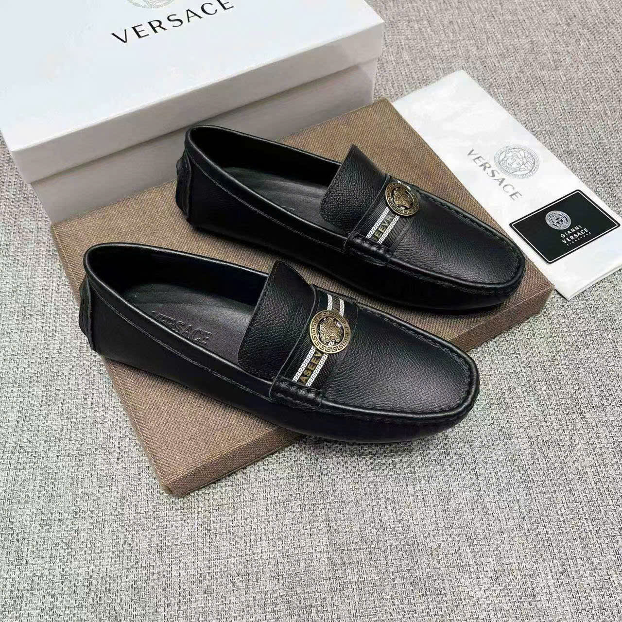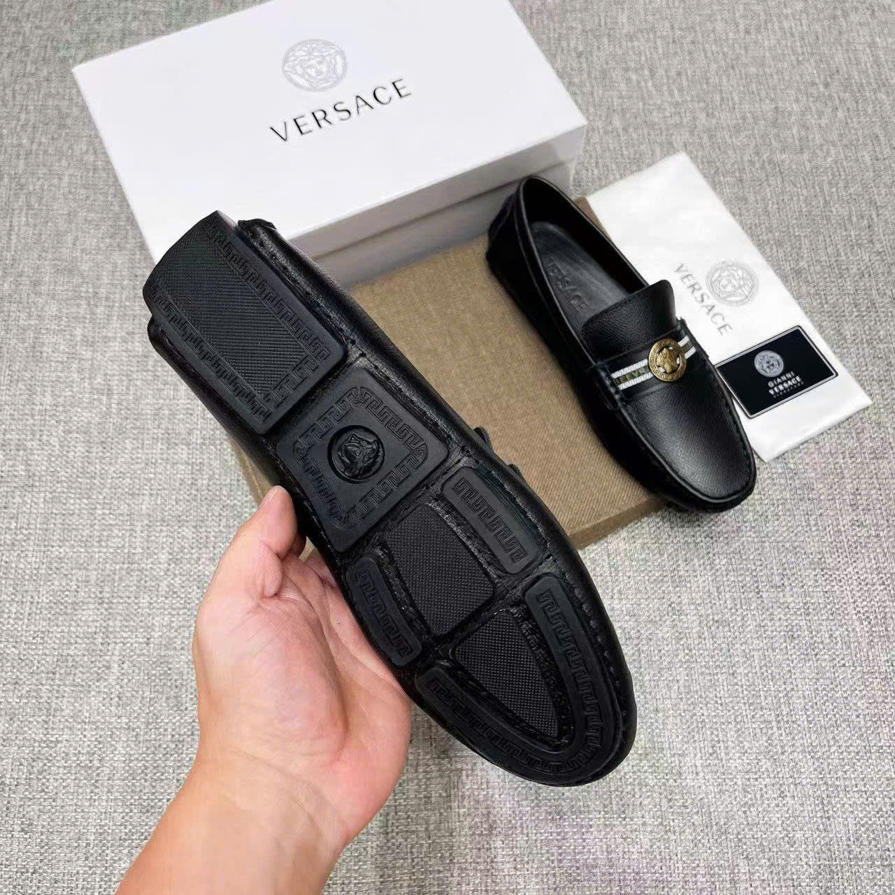 Ảnh chụp thật Giày lười Versace màu đen da sần hoạ tiết logo tròn tang chữ GLV20 hàng siêu cấp do xưởng sản xuất cung cấp.