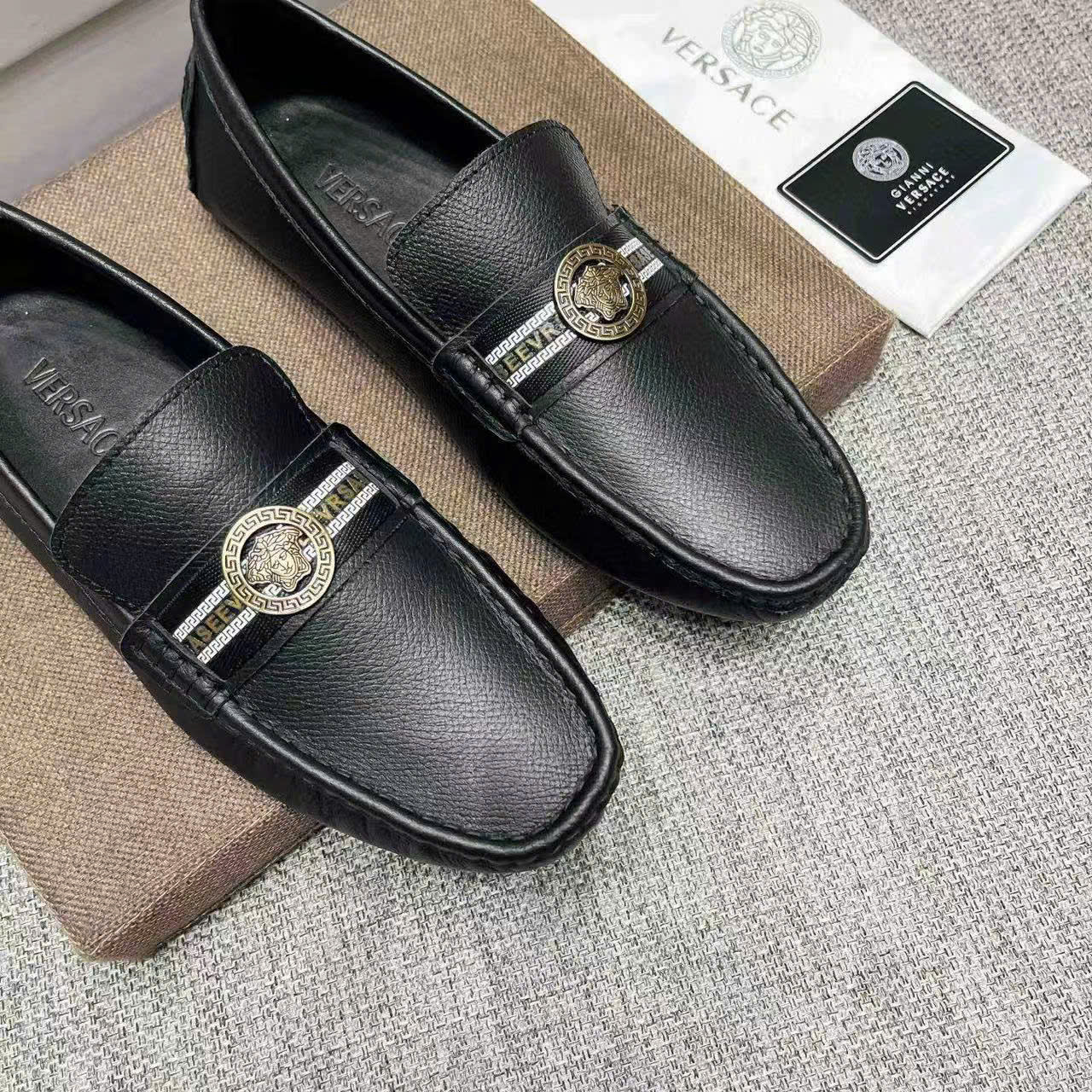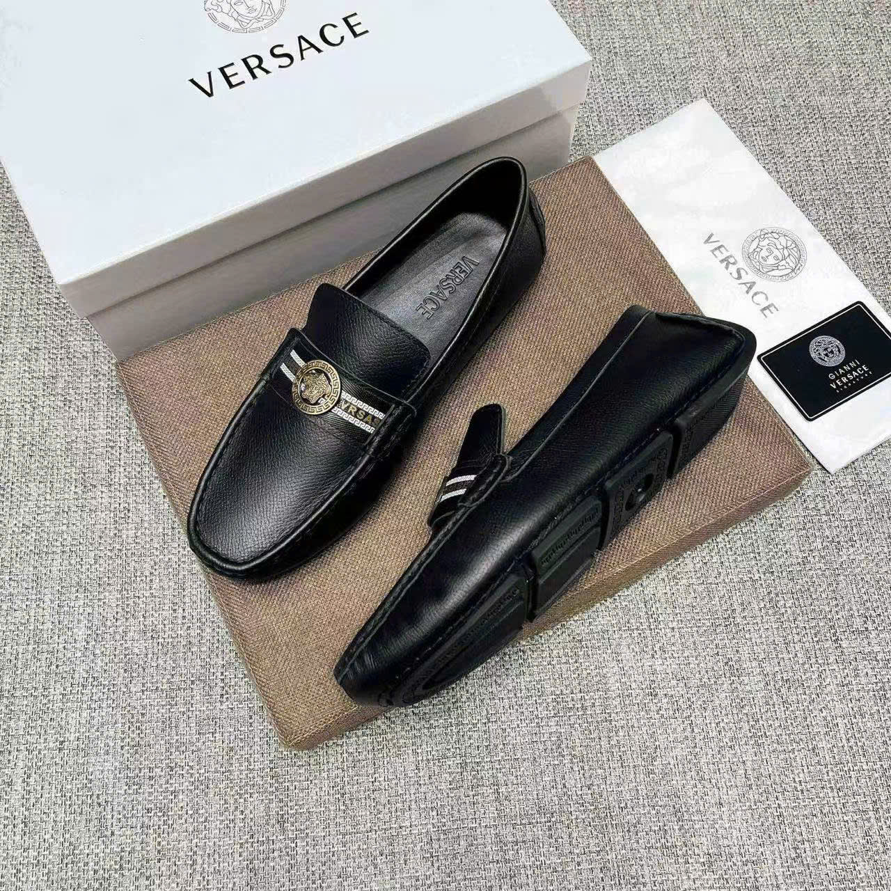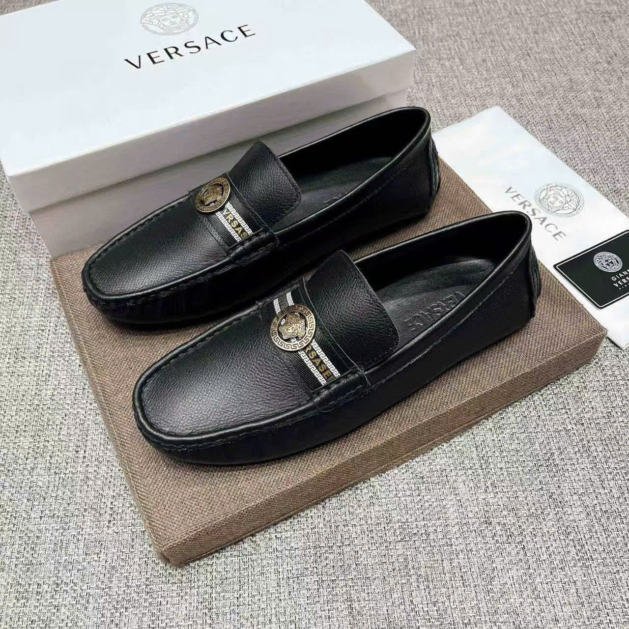 Ảnh chụp thật Giày lười Versace màu đen da sần hoạ tiết logo tròn tang chữ GLV20 hàng siêu cấp do xưởng sản xuất cung cấp.