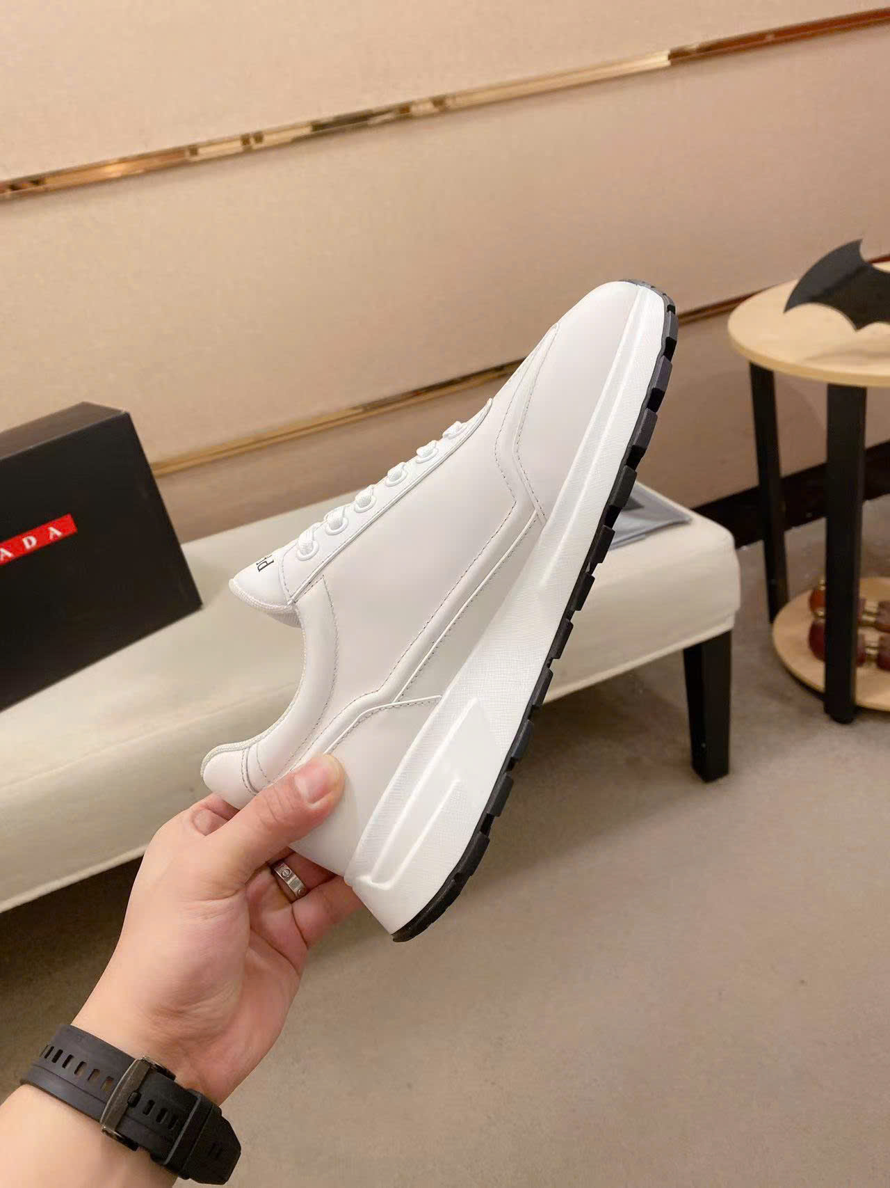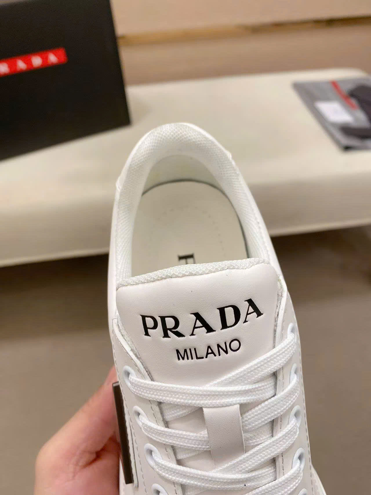 Ảnh chụp thật Giày nam Prada màu trắng da trơn họa tiết logo tam giác đen GNP28 hàng siêu cấp do xưởng sản xuất cung cấp.