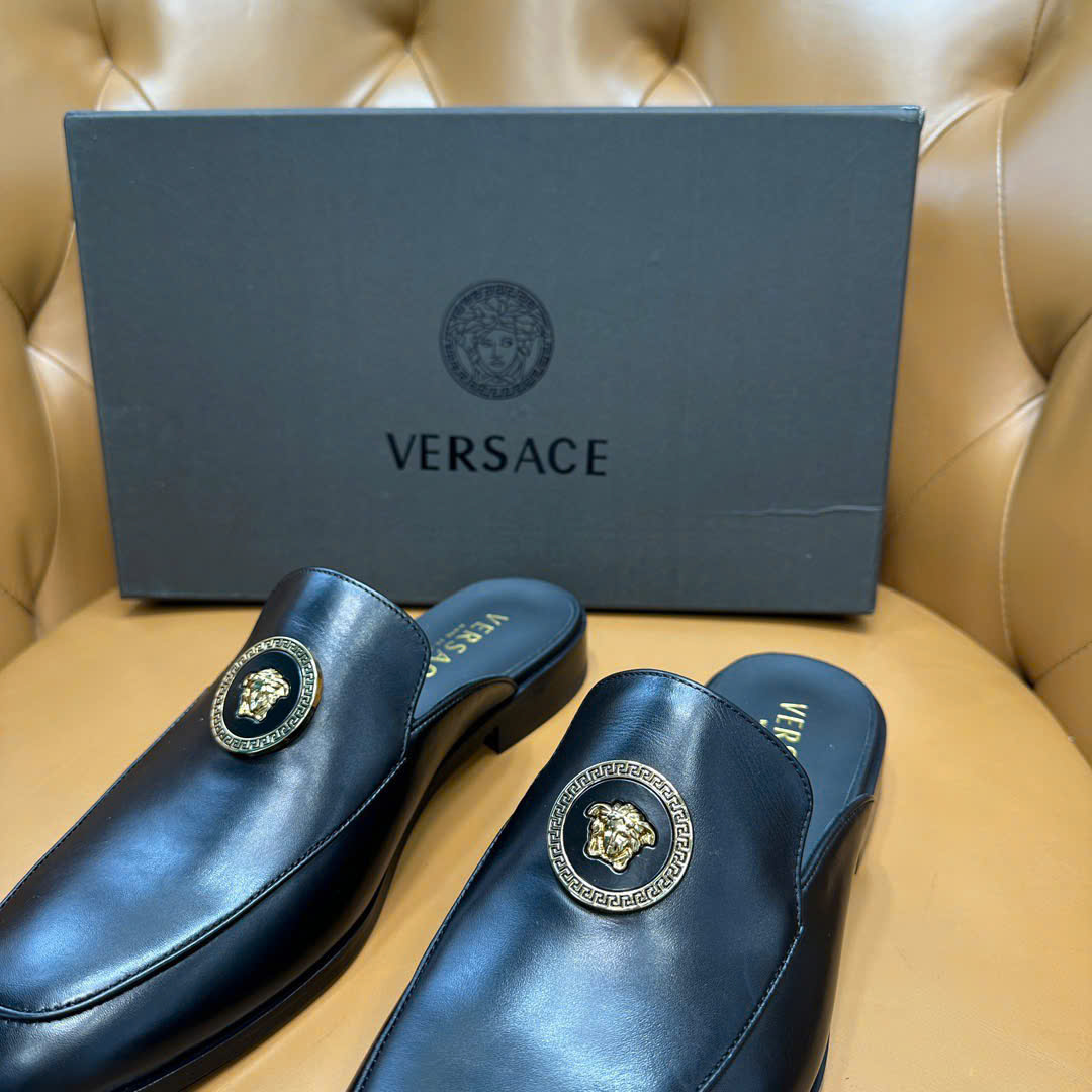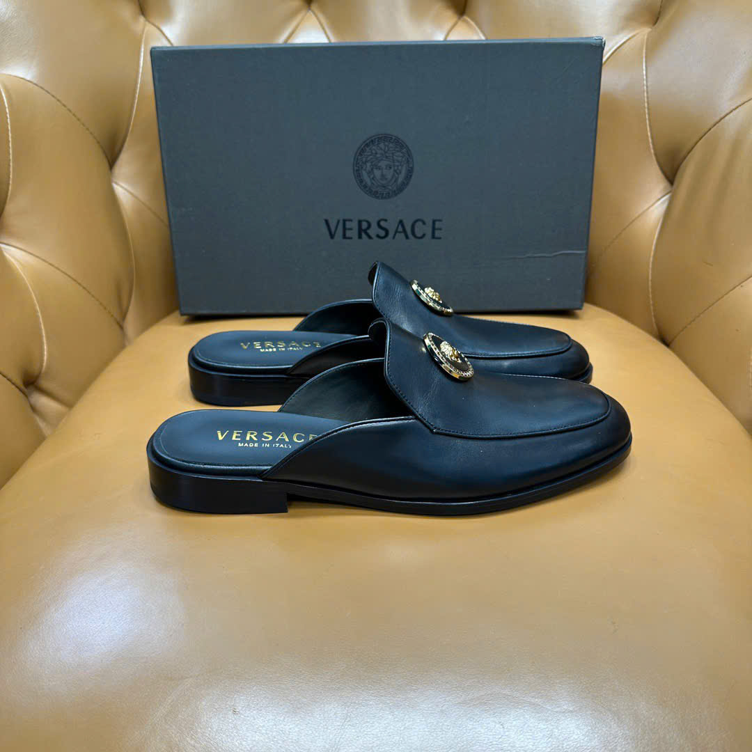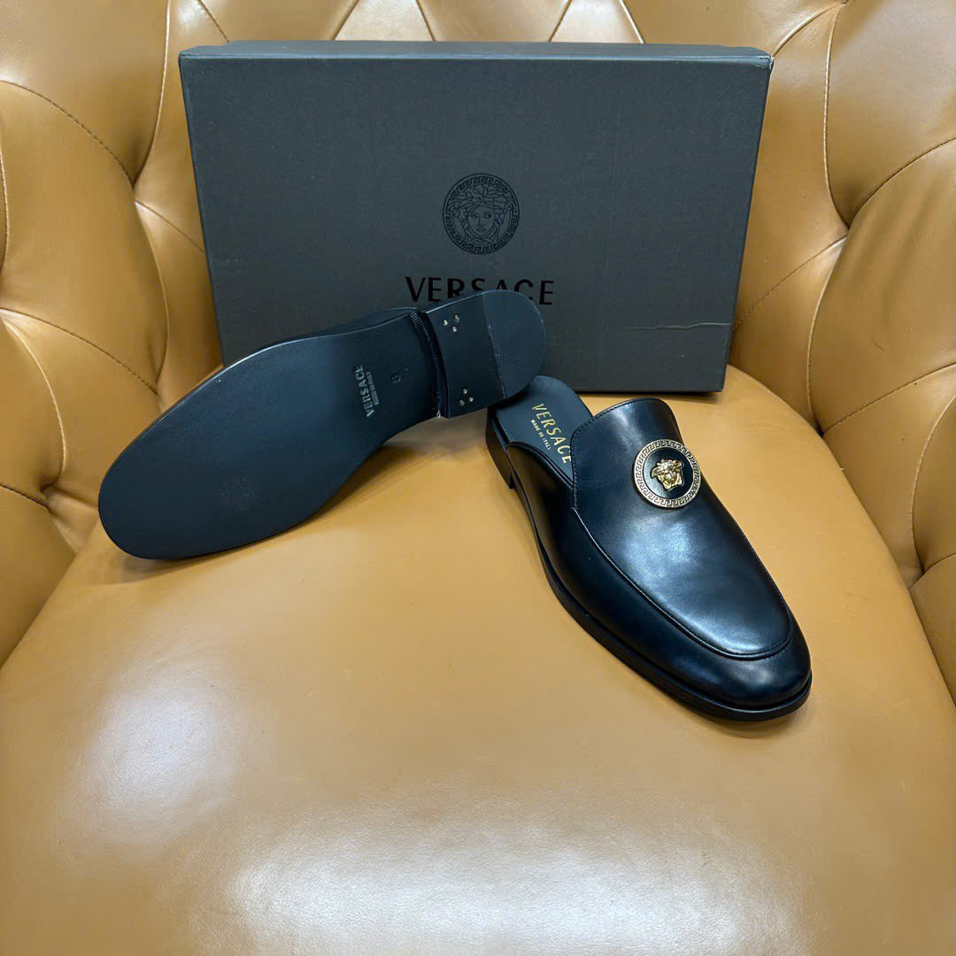 Ảnh chụp thật Sục nam Versace màu đen da trơn hoạ tiết logo tròn GLV19 hàng siêu cấp do xưởng sản xuất cung cấp.