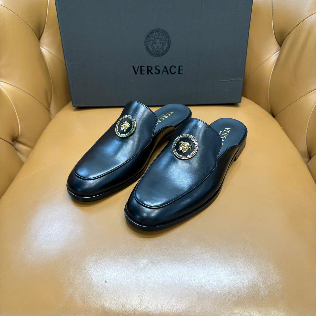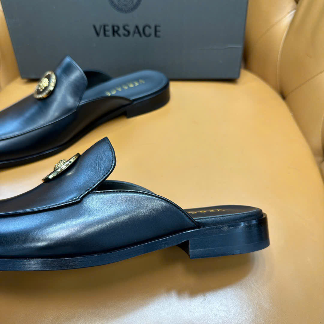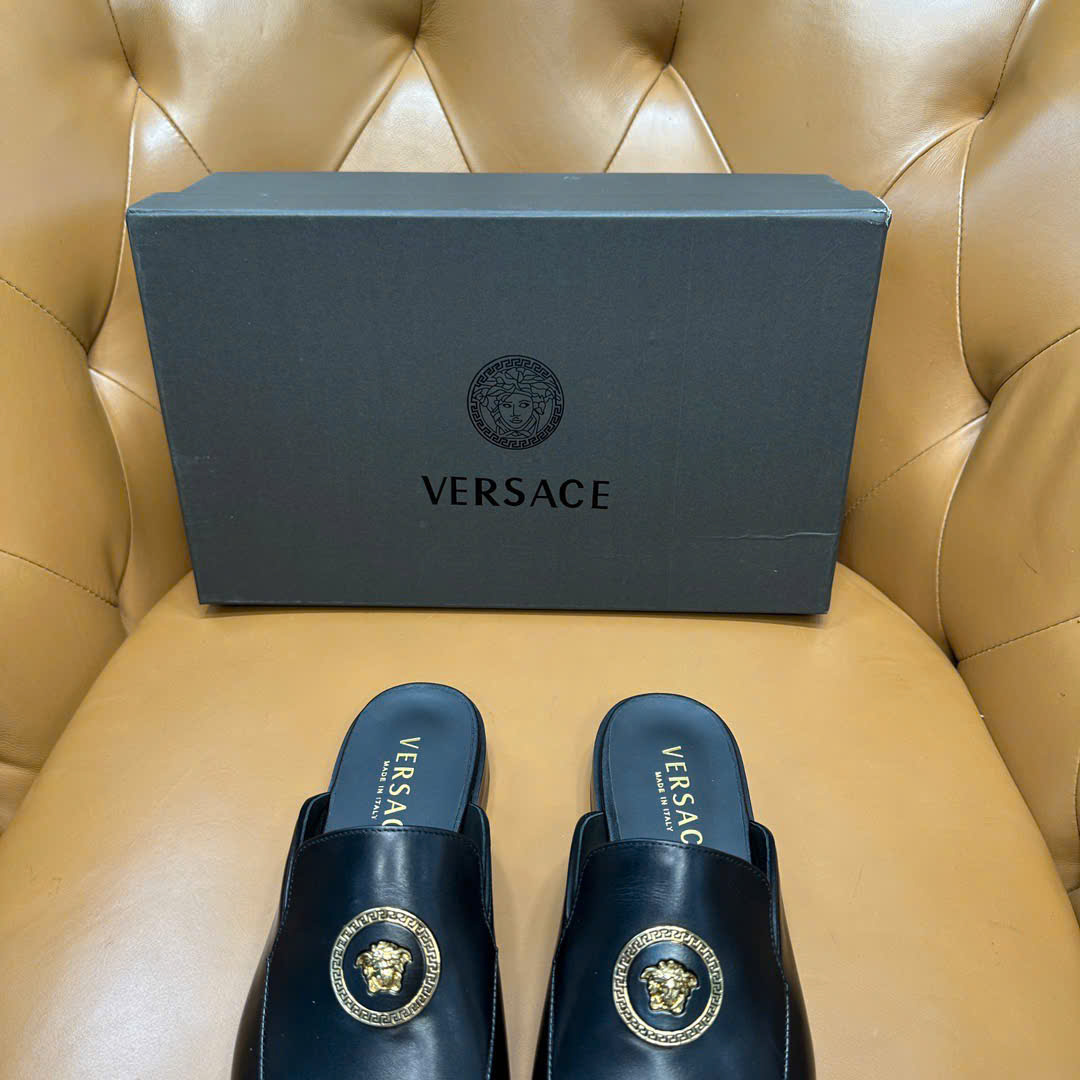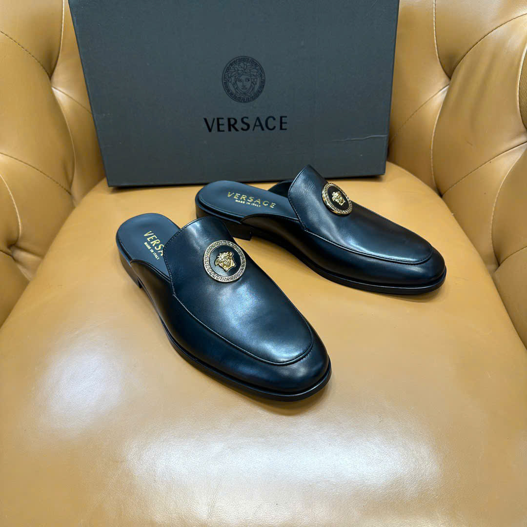 Ảnh chụp thật Sục nam Versace màu đen da trơn hoạ tiết logo tròn GLV19 hàng siêu cấp do xưởng sản xuất cung cấp.